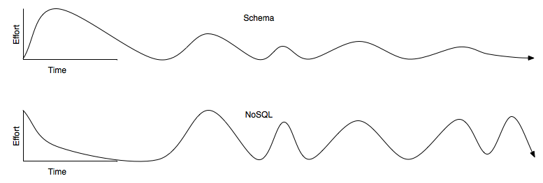 Initially mongo seems to save on effort until the first valley - initial launch. At this point, the system launches and typically starts interacting with other systems and with users - data requirements change towards reality, which means code - i.e., function and logic - changes, not just model. In our environment, all other systems that use the data must also change their code which seems harder than the originating code. The code and the data are so intermixed that seemingly any and every change in either domain makes knock-on effects that have to be addressed.